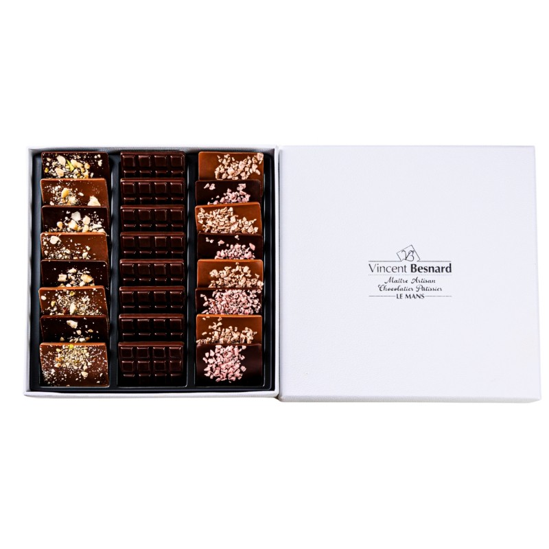 Coffret Mini-Tablettes 110gr,  assortiment (lait fraise, noir framboise, St Domingue, lait mendiant, noir mendiant).
