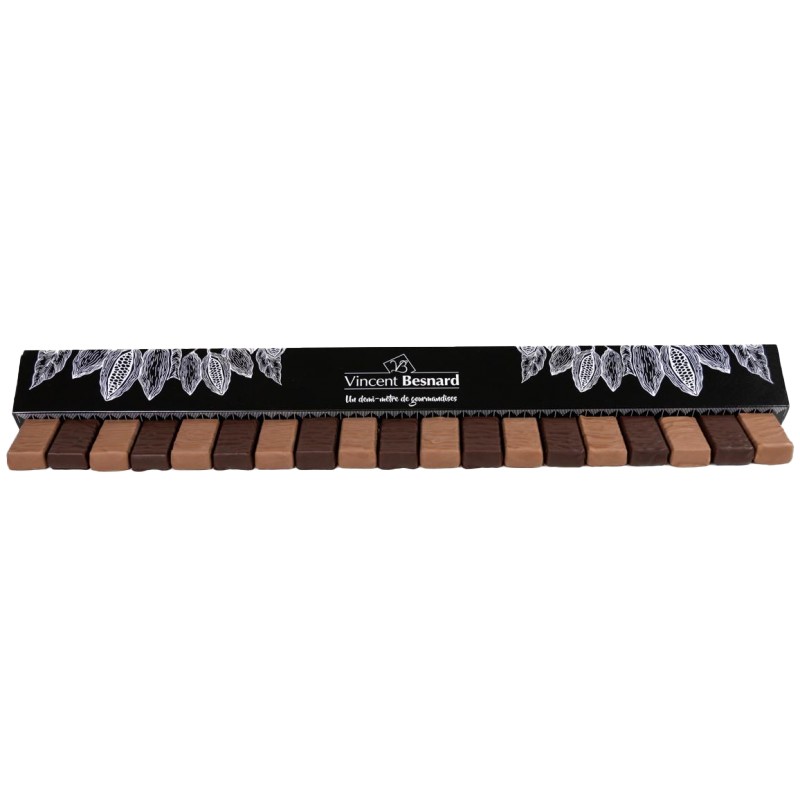 Coffret demi-mètre contenant 19 mini barres assorties lait et noir avec un caramel fondant et gianduja.